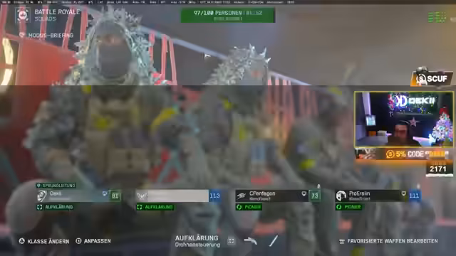 00:41:22Ungeachtet der technischen Hürden wird über die Spielstrategie gesprochen. Um im Battle-Royale-Modus erfolgreich zu sein, entscheiden sich die Spieler dafür, sich auf die Platzierungspunkte statt auf Kills zu konzentrieren. Sie identifizieren Landeorte wie 'Linden' und 'Ölwerke' als vielversprechend und planen, durch Goldene Truhen Waffen wie die KTS-LMG und SMGs für das Team zu sichern. Die Rollen (Aufklärer, Versorger) werden verteilt, um die Drohnen des Teams effektiv einsetzen zu können.
