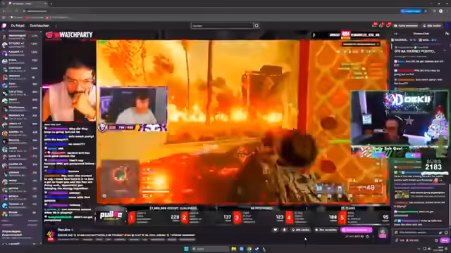 02:55:00Im finalen Abschnitt kämpfen die Spieler unter starkem Druck gegen mehrere Teams gleichzeitig. Sie nutzen Drohnen und Radar aktiv, um Gegner zu orten und anzugreifen, werden aber schließlich durch präzise Snipereinsätze und Panzer eliminiert. Nach dem Ausscheiden folgt eine Analyse der Platzierung und der erzielten Kills. Die Runde wird als Herausforderung beschrieben, bei der strategische Fehler in der Rotation und der Umgang mit Panzern thematisiert werden. Trotz des Ausscheidens zeigt sich das Team zuversichtlich für zukünftige Runden.
