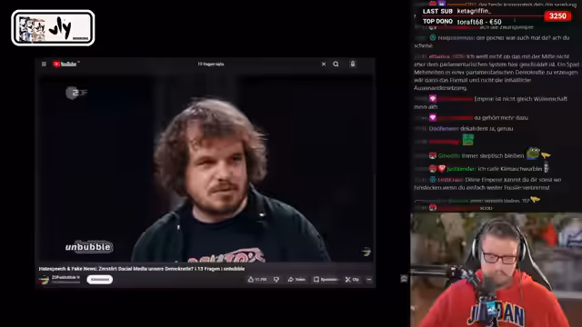 03:10:15Der Streamer erläutert das Paradoxon der Toleranz nach Karl Popper: unbegrenzte Toleranz gegenüber Intoleranten führt zur Zerstörung der toleranten Gesellschaft. Die Sendung trage mit ihrer Palette an Gästen zur Normalisierung extremer Positionen bei, während sie gleichzeitig vorgibt, diese überwinden zu wollen. Dies schaffe eine problematische Verschiebung des Overton-Fensters.