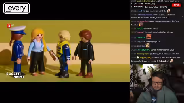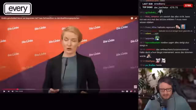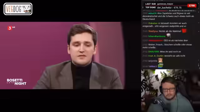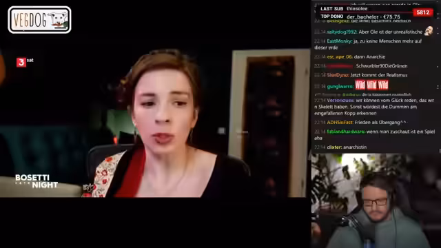 03:42:29In der letzten Phase interagiert der Streamer mit seinem Publikum und erwähnt Zuschauer mit kritischen Kommentaren. Als ironische und zugleich selbstironische Selbstbezeichnung bezeichnet er sich und seine Anhänger als 'Eso-Stalinistinnen', was als provokante Schlussbemerkung zu verstehen ist, die verschiedene Ideale des Streams bündelt.