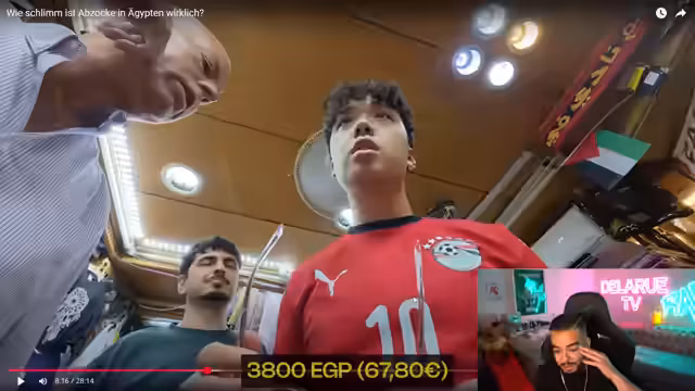 04:18:45Der Streamer ist live in Ägypten und startet ein Experiment zur Abzocke. Am Flughafen Kairo wird ein Taxifahrer ('Abdallah') angeheuert, der den Preis von 240 EGP (ca. 7€) für das Hotel auf 600 EGP (ca. 18€) hochhandelt – nachdem er mehrfach beteuert hatte 'kein Scam'. Der Vergleich mit Uber zeigt, dass der Preis deutlich höher ist. Später auf einem Markt versucht der Streamer, Trikots zu kaufen. Ein Verkäufer bietet ein Fake-Trikot für 3800 EGP (67€) an, was als Witz entlarvt wird. Der Streamer demonstriert Verhandlungstaktiken: Mit aggressivem Runterhandeln (auf 10% des Angebots) und 'Dreistigkeit gegen Dreistigkeit' kann man Preise drücken. Er kauft schlussendlich Parfums und zeigt seine private Sammlung.