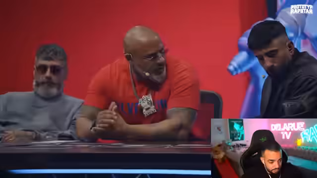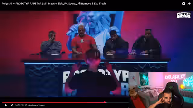 01:02:55Der Streamer startet die Reaction auf 'Prototyp Rapstar' und lobt das Format. Die Jury besteht für ihn aus bedeutenden Persönlichkeiten: Ali Boumaier (Bester Entertainer), PA Sports (Bester CEO) und Sido (Bester Rapper). Er äußert Respekt für die Kompetenz der Jury und betont, dass er selbst trotz Konkurrenz gespannt auf die Show ist, sich aber gleichzeitig für Rap La Rue 3 bewirbt, um ein neues Talent zu finden.