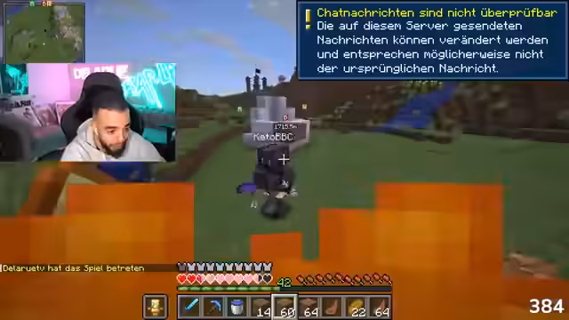 06:43:49Der Streamer sitzt in Minecraft unter Wasser fest und ringt um Luft, während er um Hilfe bittet. Er kündigt an, bis 9 Uhr mit Ono-Chan und Harley weiterzustreamen und interagiert mit Spielern wie Ligi, die ihn aus der misslichen Lage befreien sollen. Gleichzeitig erwähnt er den Ausbau seiner Basis, diskutiert über Portal-Platzierungen und plant weitere Aktionen wie das Töten von Gegnern. Die Szene zeigt seine Verzweiflung und gleichzeitig den Fortbestand des Spiels trotz technischer Herausforderungen.