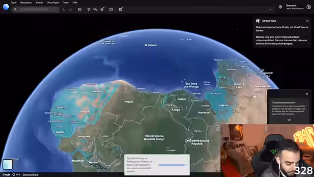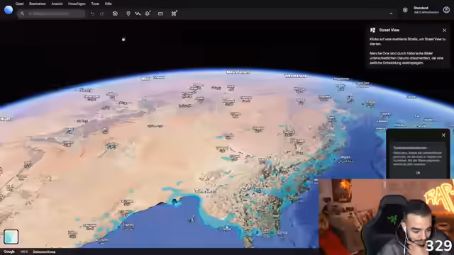 07:29:20Der Streamer startet ein neues, interaktives Segment, bei dem er Zuschauerländer mit Google Earth erkunden möchte. Das Ziel ist es, durch verschiedene Länder zu reisen und diese zu bewerten, bis eine als "hässlich" betrachtete Landschaft erscheint. Die Zuschauer sollen aktiv mit Vorschlägen für die nächsten Länder teilnehmen.
