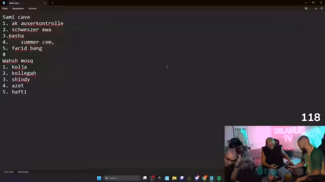 00:13:34Del La Rue und Wesh starten einen Aux-Battle, für den sie sich auf Rapper-Namen einigen. Sie legen eine Liste mit Künstlern wie Haaland, Loredana, Bobby, Haftbefehl und Shindy fest. Anschließend ziehen sie jeweils fünf Künstler aus und spielen gegeneinander. Das Duell ist sehr knapp und endet unentschieden, 2-2. Als Wette verlieren die Verlierer die Haare. Der Streamer äußert Bedenken und betont, dass dies eine ernste Wette sei. Dela Rue verliert das Duell gegen Wesh, sodass dieser ihm die Haare raspeln wird.