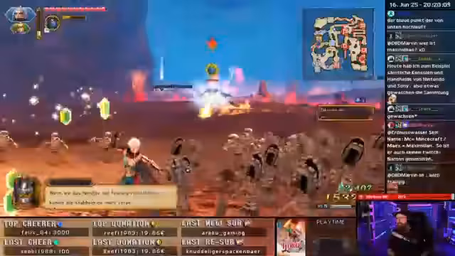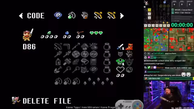 01:05:38Der Stream setzt seine lange Spielzeit von 26 Stunden fort, wobei der Fokus auf dem Sammeln von Items und der Vervollständigung von Nebenquests liegt. Neben dem Abschluss der EX-Quests, steht das Herstellen von Amiibos und die Beschaffung von Ausrüstung mit erhöhter Haltbarkeit auf der Agenda. Die Jagd nach Krokodilen und das Auffüllen des Inventars mit selteneren Materialien wie Opalen stehen im Vordergrund.