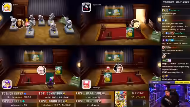 Der Abend startet mit dem SMW-Hack 'Peachy Mode World', gefolgt von Mario Party mit Dingo, Nafal und Arcade Schokolade, inklusive Kamera-Integration. Stormson zeigt anschließend den 'Donkey Kong Bonanza Any Speed Run'. Es werden neue Strategien und Glitches entdeckt, während die Gruppe sich durch verschiedene Minispiele kämpft. Der Streamer plant weitere Speedruns.