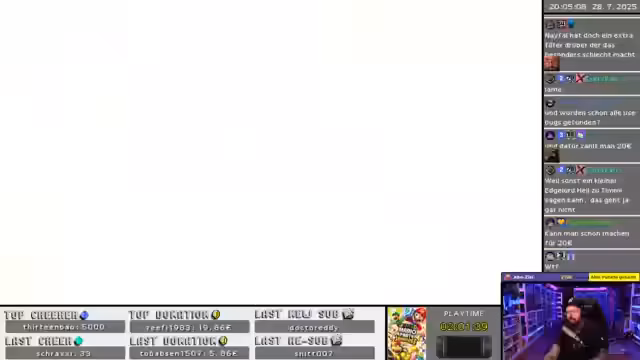 02:14:47Vor dem eigentlichen Start der Mario Party Session gibt es erhebliche technische Schwierigkeiten. Der Streamer kämpft mit der Einrichtung der Kameras, Mikrofone und der Verbindung zwischen den Spielern. Es kommt zu Verzögerungen, Missverständnissen und technischen Problemen. Der Streamer ist frustriert, aber gleichzeitig fasziniert von dem chaotischen Prozess und vermutet, dass die letztendliche Erfahrung unterhaltsam sein wird, auch wenn technische Probleme die Basis des Erlebnisses ausmachen.