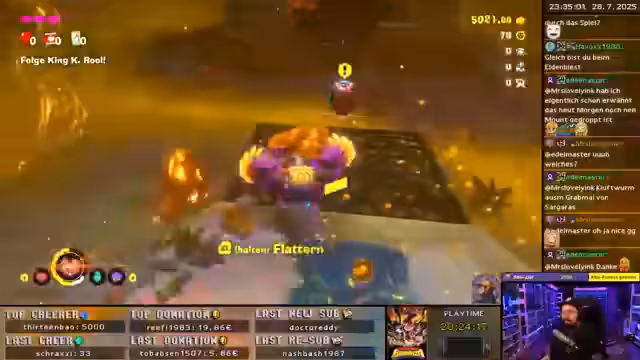 07:25:39Im Endgame des Speedruns konzentriert sich der Streamer auf das Sammeln von Gold, um Kong Bananza zu nutzen und bestimmte Abschnitte zu überspringen. Besonders wichtig ist das Verständnis der Chunk Jump-Technik, die dabei hilft, große Lavafelder zu überwinden. Für den finalen Bossfight gegen K. Rool empfiehlt der Streamer, eine aggressive Vorgehensweise zu wählen, mit dem Elefanten Kugeln aufzusaugen und in seine Strudel zu werfen. Nach dem Sieg über K. Rool folgt ein Autoscroller-Abschnitt, bei dem Goldklumpen gegen den Boss geworfen werden müssen.