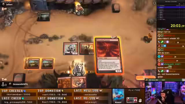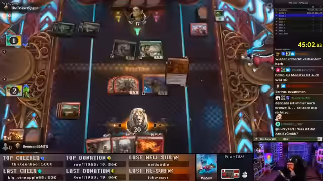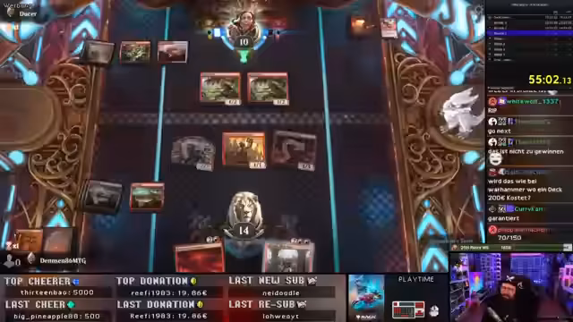 00:16:28Im Fokus des Streams steht eine 90-minütige Magic: Arena Challenge. Der Streamer und der Co-Streamer @Sol4r1s, der auch auf der Gamescom anwesend ist, spielen mit einem frischen, kostenlosen Account. Das Ziel ist innerhalb der Zeit den höchsten Rang zu erreichen. Der Streamer teilt seine Strategie für ein rotes Goblin-Deck mit. Parallel dazu unterhalten sich die beiden über die bevorstehende Gamescom-Laden, insbesondere über den Trading Card Bereich.