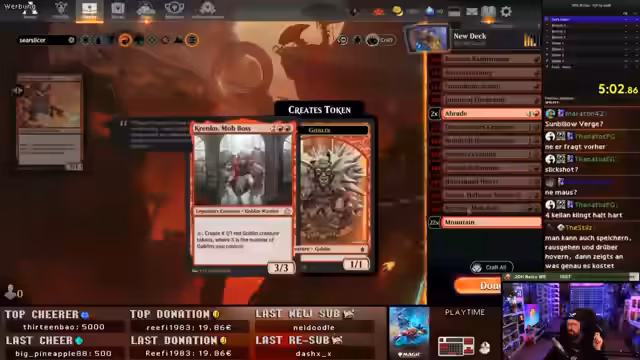 02:18:49Nach dem Öffnen der Booster-Packs beginnt die anspruchsvolle Phase des Deckbaus. Beide Streamer müssen mit einer begrenzten Anzahl an Wildcards auskommen, was zu strategischen Kompromissen zwingt. Der Fokus liegt darauf, aggressive und schnelle Decks zu bauen, um die Spiellänge zu verkürzen. Es wird über verschiedene Deck-Konzepte diskutiert, von Goblin-Decks mit der 'Start Your Engine'-Mechanik bis zu Burn-Decks, die direkt Schaden an den Gegner verursachen. Die Herausforderung besteht darin, eine ausgewogene Mana-Basis und genug effektive Karten zu erhalten, was oft den Verzicht auf seltene (Mythic) Karten zugunsten häufigerer Karten erfordert.