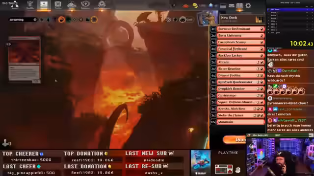 02:33:58Der Streamer kämpft mit dem Deckbau, da viele benötigte Karten fehlen und Wildcards knapp sind. Er überlegt, welche Karten er entfernen kann, um das Deck fertigzustellen. Der Chat gibt Tipps, wie man den Überblick über fehlende Karten behält. Der Streamer muss Kompromisse eingehen und auf Common-Karten zurückgreifen. Solaris hat sein Deck bereits fertiggestellt und bietet an, seine Liste zu schicken. Der Streamer überlegt, ob er noch Rare Wildcards investieren soll. Er entscheidet sich, den Start Your Engine auszuprobieren. Es wird festgestellt, dass es keine Vorliga für neue Spieler gibt. Der Streamer überlegt, welche Karten er noch hinzufügen könnte, um sein Deck zu verbessern. Der Streamer entscheidet sich, Screaming Nemesis ins Deck zu nehmen und muss dafür andere Karten entfernen. Er reduziert die Anzahl der Länder auf 21. Der Streamer startet das erste Spiel und hofft auf eine gute Starthand.