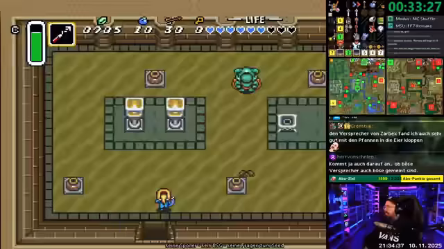 04:53:41Der Streamer analysiert seinen Rennlauf in Zelda ALTTPR, der eher suboptimal verlief. Er verbrachte viel Zeit in Dungeons, die sich später als "Pendent Dungeons" herausstellten und nicht für den Fortschritt notwendig waren, was zu Frustration führte. Seine Platzierung lag im Mittelfeld, und er berichtet über späte Schlüssel- und Items wie die "Boots", die den Lauf erschwerten. Gleichzeitig treten technische Probleme auf, darunter ein Ausfall des Tons und ein Ausfall der Emulatorsoftware, was den Rennverlauf zusätzlich beeinflusste.