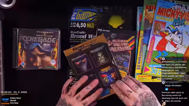 00:22:40Nach dem Auspacken von persönlichen Geburtstagsgrüßen wendet sich der Streamer einem Paket mit alten PC-Spielen und Magazinen zu. Das Paket enthält eine beeindruckende Sammlung von Bestseller-Spielen für Windows XP, darunter Klassiker wie Diablo 1, StarCraft Brood War, Command & Conquer und Renegade. Begleitet wird dies von einer Flut alter PC-Spiele-Magazine, darunter GameStar, PC Games und Arcade-Classics, die die damalige Spielekultur und Werbung dokumentieren. Die Enthüllung dieser Sammlung weist auf die thematische Fokussierung des Streams hin, der sich dem alten Scheiß widmet.