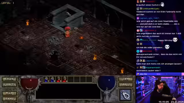 01:22:33Der Fokus des Streams liegt nun auf dem Gameplay von "Diablo 1". Der Streamer erkundet das Dorf, feuert Feuerbälle und stellt die manuelle Bewegungs- und Angriffsgeschwindigkeit des Spiels dar. Trotz einer Bildstörung, die durch die Capture-Karte verursacht wird, geniezt er den Klang des Soundtracks, insbesondere das Geräusch, wenn Gold aufgesammelt wird. Dies unterstreicht die Absicht des Streams, die pure Nostalgie des alten Spielerlebnisses zu vermitteln, jenseits technischer Perfektion.