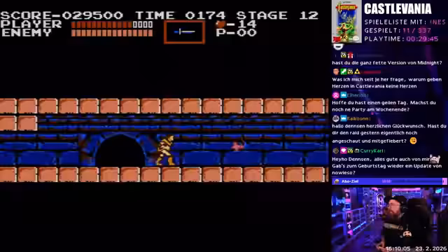 01:55:00Der Streamer beginnt mit dem Spiel Castlevania auf dem NES, bewundert den Soundtrack und die Atmosphäre des Spiels, die ihn an Konami-Peak-Zeiten erinnert. Der Spielverlauf wird jedoch von einer hohen Schwierigkeit und vielen Toden geprägt, besonders gegen den finalen Boss. In den Pausen zwischen den Versuchen liest er im Chat Geburtstagsgrüße vor, erwähnt die große Geburtstagsfeier am Wochenende, zu der über 50 Personen eingeladen sind, und zeigt ein Geschenk von einem Viewer, eine Liliana-Karte für ein Magic-Deck.