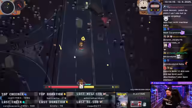 00:45:38Der Versuch, 12 Minuten in einer Welle zu überleben, gestaltet sich als erhebliche Herausforderung. Der Streamer kämpft mit einer zu kleinen Karte, einem niedrigen Inventarplatz und der fehlenden Möglichkeit, sich zu heilen. Obwohl er mit einem Flummi-Modifikator enorme Mengen an Erfahrungspunkten sammelt und seine Waffe bufft, scheitert er mehrfach am Timer und den Bedingungen des Spiels. Errestartet häufig, um einen günstigen Start mit viel Beute und einer großen Karte zu erreichen.