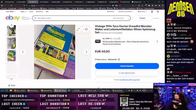 06:07:52Die Suche nach Retro-Spielzeug führt den Streamer zu dem Artikel 'Foodmaker' von Dr. Dreadful auf eBay, einer nostalgischen Maschine aus den 90ern, mit der man süßes Labor-Gemisch herstellen kann. Er beschreibt die wilden 90er, in denen solcher kreativer 'Müll' noch ohne Bedenken gekauft wurde. Nach intensiver Recherche und Preisvergleich entscheidet er sich, das Gerät für 60 Euro aus Italien zu bestellen und es in einem zukünftigen Stream zu unvorhersehbaren Experimenten zu verwenden.