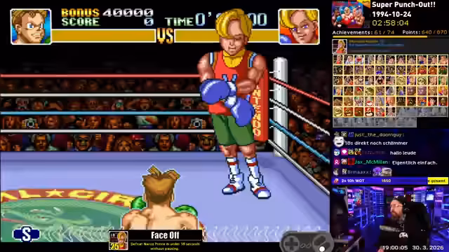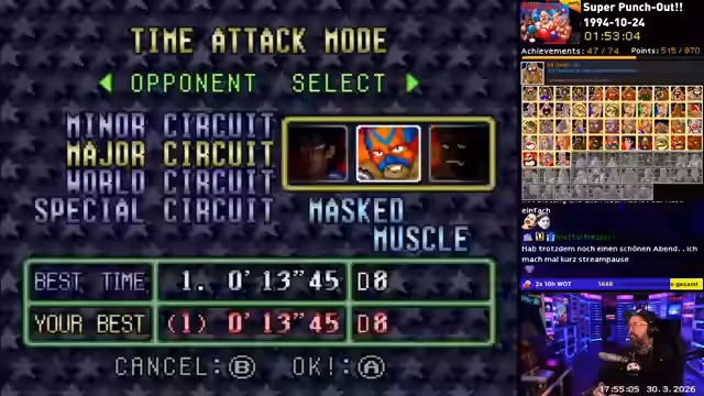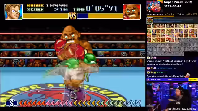 00:21:29Hauptfokus des Streams ist das Retro-Achievements-System mit dem Spiel Punch-Out. Der Streamer kündigt an, dass sein Mario-Erfolg bisher nicht bestätigt wurde, was ihn stört, während Zelda schnell abgeschlossen wurde. Der Großteil der Zeit wird mit dem Versuch verbracht, schwierige Achievements wie das Besiegen von Gegnern in unter 13 oder 18 Sekunden zu meistern. Diese Challenges werden als extrem RNG-basiert und frustrierend beschrieben, da man exakte Timing- und Abfolge-Muster finden und abrufen muss.
