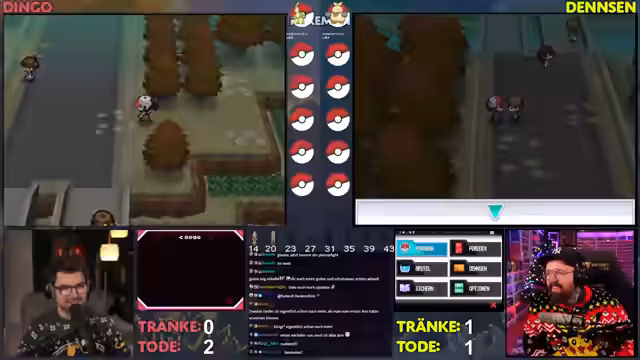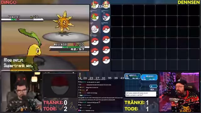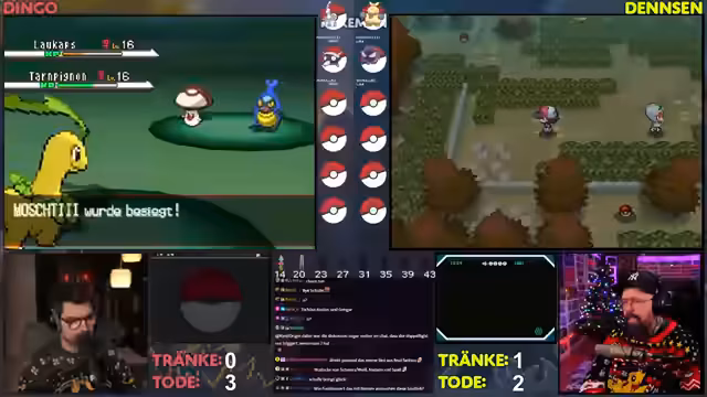 00:55:58Der Streamer und Dingo starten das Pokémon Schwarz Soullink-Spiel. Sie sind beeindruckt von der verbesserten Optik des Emulators mit Soft Rasterizer und vierfacher Geschwindigkeit. Der Streamer wählt ein Mädchen als Charakter, da dies beim letzten Mal Glück gebracht hat. Sie erhalten ihre Starter-Pokémon: Der Streamer bekommt ein Plinfa, Dingo ein Flemmli. Sie erleben ihren ersten Rivalen-Kampf, bei dem der Streamer mit seinem Plinfa gegen ein übermächtiges Aufruhr verliert. Sie stellen fest, dass es viele Rivalen-Kämpfe im Spiel gibt, was eine Herausforderung darstellen könnte. Sie fangen ihre ersten wilden Pokémon, darunter ein Quiekel für den Streamer und ein Hopspross für Dingo, und benennen sie mit Hilfe eines Stream Elements Plugins nach Chat-Namen.