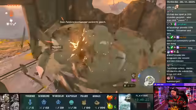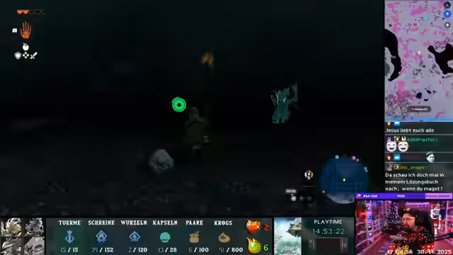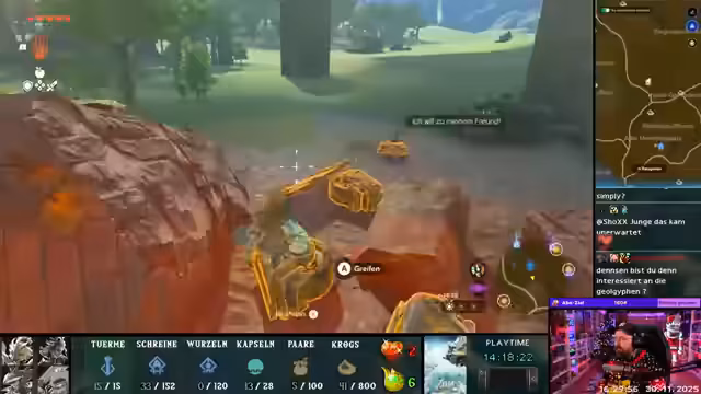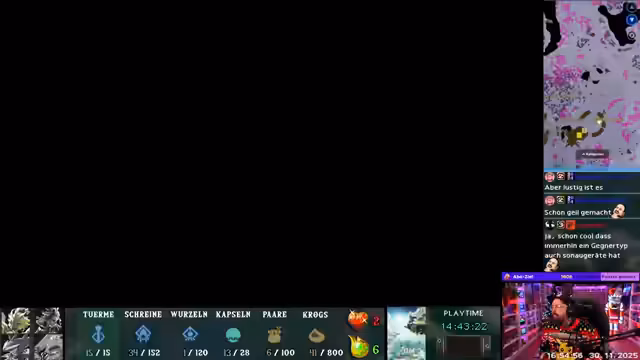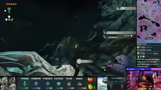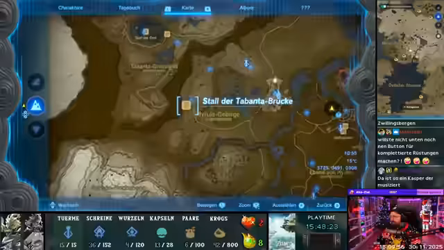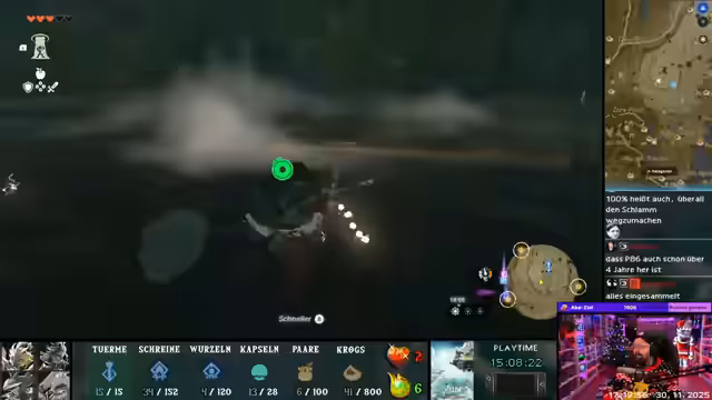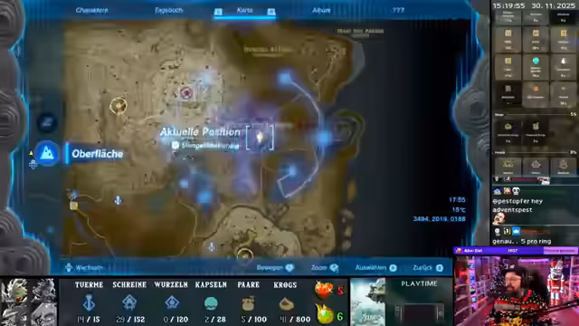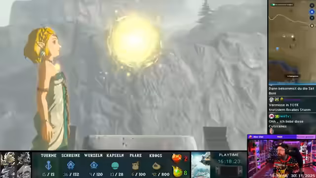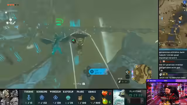 03:24:02Nach einer kurzen Pause beginnt der Streamer mit Zelda: Tears of the Kingdom, mit dem Ziel, 100% des Spiels zu erreichen. Ein speziell angefertigtes Overlay soll dabei helfen, den Fortschritt zu verfolgen, indem es getrackte Werte wie Schreine, Krogs, Herzen und Ausdauerringe anzeigt. Die genaue Erfassung dieser Werte erweist sich jedoch als komplex, da die In-Game-Anzeige nur prozentuale Werte liefert. Es wird beschlossen, die Crocs-Paare zusammenzufassen, um Platz für weitere Informationen zu schaffen. Der Streamer definiert seine persönliche 100%-Definition, die das Sammeln von Schilden und Rüstungssets ausschließt, da diese als langweilig empfunden werden. Der letzte fehlende Turm wird als primäres Ziel identifiziert, um die Karte vollständig aufzudecken.