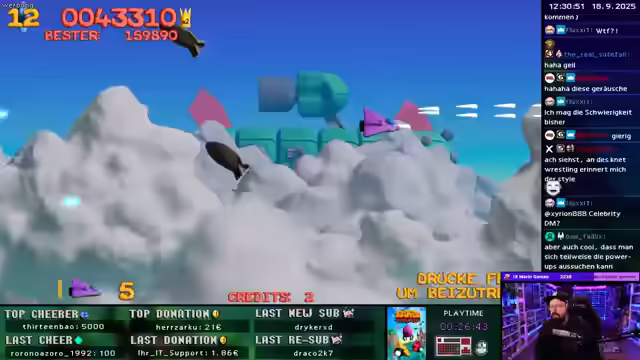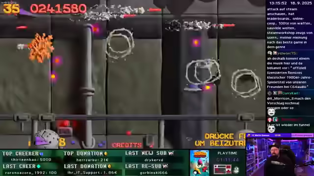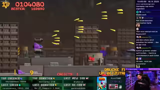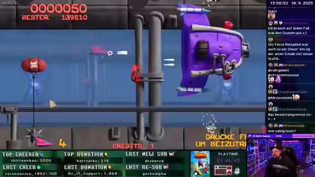 02:13:39Der Streamer startet 'Platypus Reclayed', ein von Claymatic Games gesponsertes Horizontal-Shooter-Spiel im Knete-Stil. Er wählt zunächst ein ausgeglichenes Raumschiff in Twitch-Lila und lobt den einzigartigen Stil des Spiels. Er gibt an, dass er normalerweise gut in solchen Spielen ist und beginnt, Level 1 zu spielen. Während des Spielens erklärt er die Power-Ups und Mechaniken, wie z.B. das Sammeln von Buchstaben für spezielle Fähigkeiten und das Verlieren von Power-Ups, wenn man getroffen wird. Er experimentiert mit verschiedenen Waffen wie Rapid Fire, Auto Cannon, Rockets und Homing Missiles, wobei er feststellt, dass er mit Homing Missiles nicht gut zurechtkommt. Er erklärt, dass das Sammeln von Punkten die Lebensleiste auffüllt und dass es Bonuspunkte für das Zerstören ganzer Gegnergruppen gibt. Der Streamer hofft, dass das Spiel schwierig wird und äußert den Wunsch, es durchzuspielen.