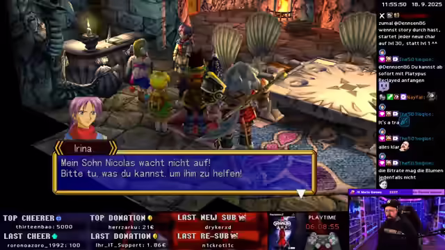 02:02:25Im Dorf Mirumu angekommen, wird das Team von den Dorfbewohnern um Hilfe gebeten, da diese unter einem Fluch leiden, der sie in tiefe Träume versinken lässt. Die Dorfbewohner erhoffen sich die Ankunft einer Priesterin aus der Kathedrale, die sie retten soll. Das Team erklärt, dass sie eigentlich nur auf der Durchreise zur Granas-Kathedrale sind, willigt aber ein, für einen Tag zu bleiben. Ein Dorfbewohner bittet Irina, seinen Sohn Nikolas anzusehen, der ebenfalls von dem Fluch betroffen ist und nicht mehr aufwacht. Irina bemerkt einen faulen Geruch und erinnert sich an einen Garten voller Feen, den sie vor dem Dorf durchquert haben. Sie erwähnt ein seltsames Mädchen namens Aira mit einer Narbe über dem Auge, was die Dorfbewohnerin Sandra als Ursache für den Fluch vermuten lässt. Irina möchte noch einmal mit Aira sprechen, um mehr über den Garten und den Fluch herauszufinden. Der weitere Verlauf führt zu der Frage, ob der Garten real ist und wie Aira in die Ereignisse verwickelt ist, was die Notwendigkeit eines baldigen Speicherns des Spielstandes unterstreicht.