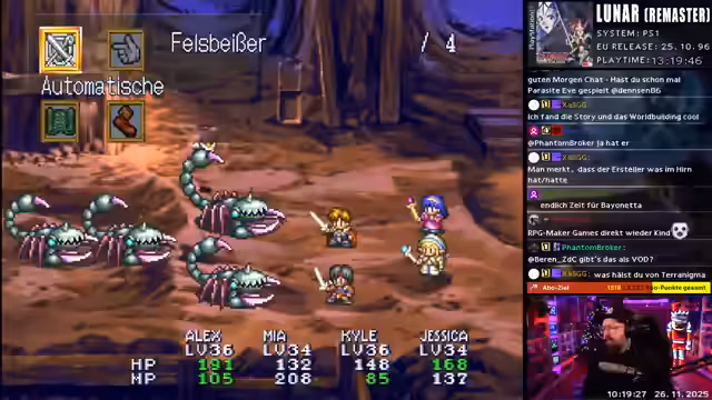 00:18:45Der Streamer ist noch unentschlossen, welches Spiel er als Nächstes spielen soll, überlegt aber, Lunar Remastered entspannt zu Ende zu bringen, um dann spontan zu entscheiden. Er räumt die Möglichkeit ein, dass das Ende des aktuellen Spiels unerwartet schwierig werden könnte und viel Grinding erfordert. Es wird eine Pause von RPGs in Aussicht gestellt, wobei Kingdom Hearts als unwahrscheinlich gilt und Persona als kurzes Spiel in Betracht gezogen wird. Prince of Persia: Sands of Time wird als potenzielle Alternative genannt, wobei die Funktionsfähigkeit der PS2 überprüft werden müsste. Das Spiel Lunar wird als "richtig schönes Spiel" und "kurzweilig und nice" beschrieben, obwohl der Streamer aktuell eine Sättigung von rundenbasierten Spielen verspürt. Die Gruppe ist in der letzten Stadt des Spiels angekommen, wo sie in eine Mine gehen muss, die das letzte Gebiet zu sein scheint. Dort hatte der Streamer bereits zuvor ein wenig gegrindet.
