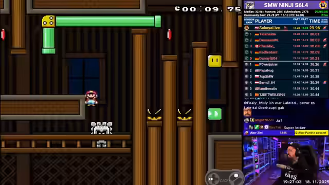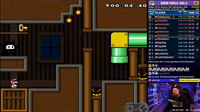 04:12:00Nach dem Ablauf des Timers für das Ninji-Finale kündigt der Streamer an, sich ein Getränk zu holen und dann die letzten Runs der Teilnehmer auf Twitch zu verfolgen, insbesondere bei Chambo und Sakaya. Er erwähnt, dass direkt im Anschluss das TAS-Video gezeigt wird, das die perfekte Ausführung des Levels demonstriert. Die Community ist gespannt auf das TAS-Video, und der Streamer bittet darum, keine Spoiler zu verraten. Während er die Streams anderer Spieler beobachtet, bemerkt er eine neue Strategie beim Booster-Einsatz, die er selbst nicht angewendet hat. Er klickt sich durch verschiedene Ninji-Streams, um die Vielfalt der Teilnehmer und deren Herangehensweisen zu sehen. Die Diskussion über die Zeitzonen und die angezeigte Deadline bei einem Streamer sorgt für Verwirrung. Der Streamer lobt die Community für ihr Engagement und die spannenden letzten Minuten des Finales.