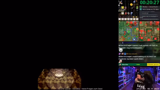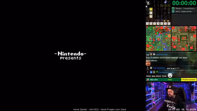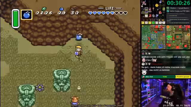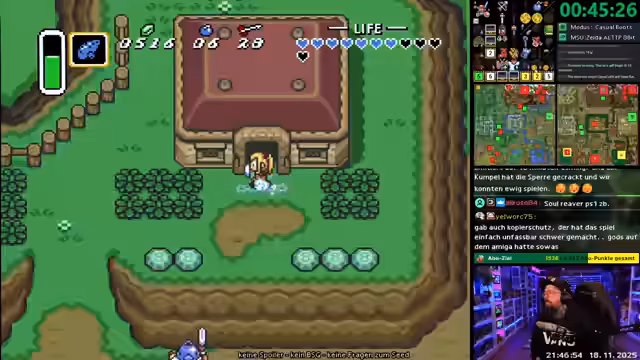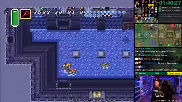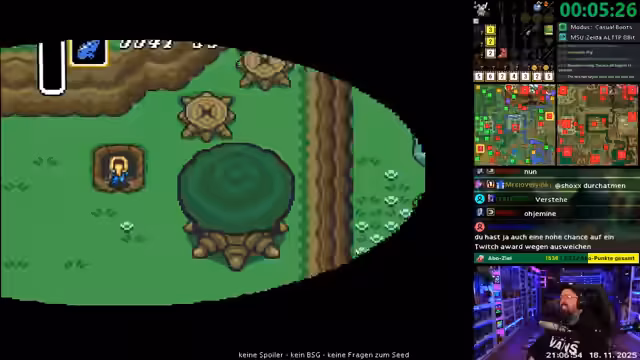 05:13:38Der Stream beginnt mit dem Zelda: A Link to the Past Randomizer im Gameboy-Stil. Das Ziel ist es, Ganon zu besiegen und alle Kristalle zu finden, wobei der Inhalt aller Truhen zufällig verteilt ist. Schnelle Fortschritte werden gemacht, und die Suche nach wichtigen Items wie Bomben und dem Pilz ist im Gange. Es wird über die geringen Gewinnchancen bei Twitch Awards gescherzt. Ein Herzteil wird gefunden, und die Suche nach dem Masterschwert und der Lampe geht weiter. Eine Flötenparty scheitert aufgrund eines fehlenden Sounds, was als traurigste Party aller Zeiten bezeichnet wird. Schließlich werden Feuer und Handschuhe gefunden, was den Weg zum Desert Palace ebnet.