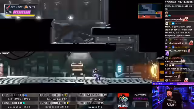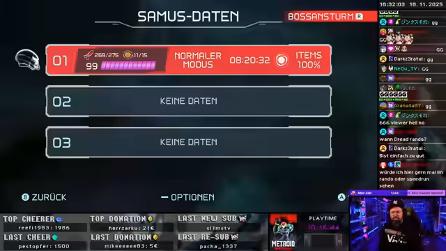 00:32:44Der Streamer befindet sich weiterhin im 'Streetfighter-Wahn' und plant, über den Master-Rang hinaus zu kommen. Es wird berichtet, dass der Master-Rang mit Juri in etwa 60 Spielen erreicht wurde, mit einer beeindruckenden Winrate von 85% und einer 10er Winstreak. Dies soll möglicherweise auch wieder im Stream gezeigt werden. Der Fokus des Streams wechselt dann zu Metroid Dread, mit dem Ziel, alle Items zu sammeln. Die Begeisterung für das Spiel und die Hoffnung auf ein unterhaltsames Sammelerlebnis werden ausgedrückt. Es wird beschlossen, von Gebiet zu Gebiet zu gehen und leuchtende Bereiche nach Items abzusuchen. Eine kurze Interaktion mit einem Zuschauer namens Slims TV bezüglich moderner Steuerung in Street Fighter 6 klärt auf, dass der Streamer keine modernen Controls verwendet, sondern auf einem Leverless-Controller spielt.