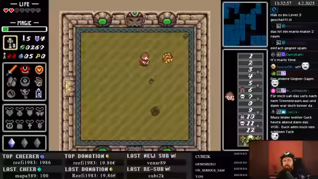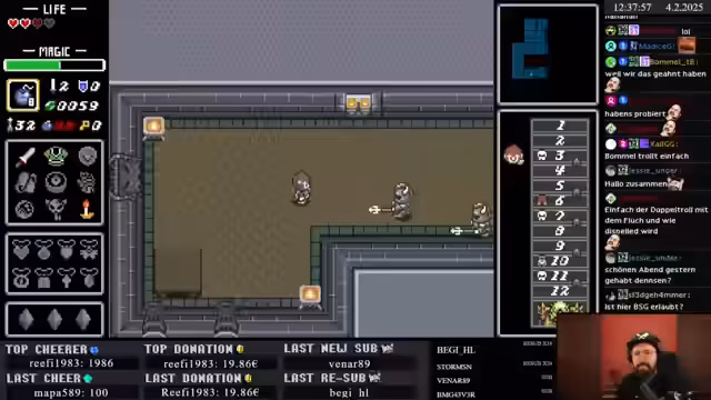 02:12:03Ein Level 4 Tunic wird gefunden, was sich sehr stark anfühlt. Der Code für einen Brunnen wird ausgetauscht (10, 7, 9, 5, 3). Ein Übergangssetup für den Stream wird erwähnt, da ab morgen wieder alles beim Alten ist. Es werden Bomben gekauft, und es wird überlegt, ob ein Bomb-Back sinnvoll wäre. Magic wird geholt, um den Stab aufzuladen. Es werden viele Rupees gefunden. Der Zauberstab verwandelt Gegner in Rupees, was als sehr gut angesehen wird. Der Streamer befindet sich in Hamburg und streamt von einem kleinen Setup bei Rocket Beans. Ein Magic Pot wird gefunden und genutzt. Eine Foodbag wird gekauft, um mehr Items mitnehmen zu können. Ebene 11 wird erreicht, und es wird erwartet, dass es nun schwieriger wird. Ein Schwert-Upgrade ist für 290 Rupees verfügbar. Der Stab ist sehr gut zum Rupees-Farm. Feuerorbs erweisen sich als nützlich. Minimoldons werden als nervig empfunden. Es wird zum Schwert gegangen, um Swordbeams zu erhalten, die sehr mächtig sind. Das Feuerorb ist stark gegen viele Gegner. Würmer werden als schlimm empfunden. Der Hookshot ist nutzlos. Ein Escape wird ausprobiert und als OP empfunden. Der Rod of Hearts verwandelt Gegner in Herzen. Die Kombination aus Schwert und Stab ist sehr gut.