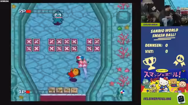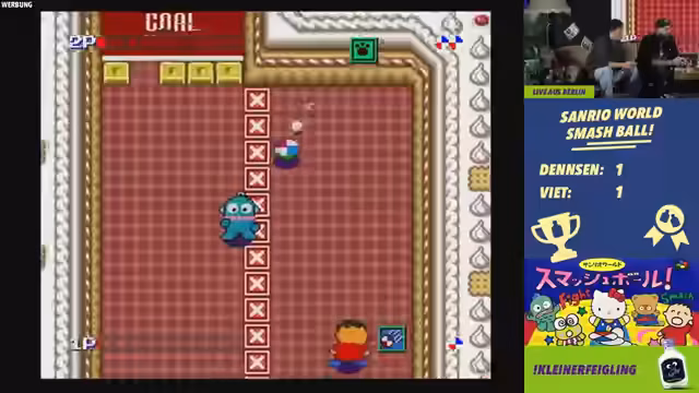 01:29:57Das Spiel wird auf einer Konsole gespielt und hat leichten Input-Lag. Charaktere wie Hello Kitty und andere Maskottchen sind wählbar. Das Spielprinzip ist simpel: man schlägt einen Ball gegen den Gegner, um Punkte zu machen. Es wird Best of 3 gespielt, wobei jede Map anders gestaltet ist und Power-Ups enthalten kann. Der Streamer und sein Gegner liefern sich ein spannendes Duell, das sie beide genießen.