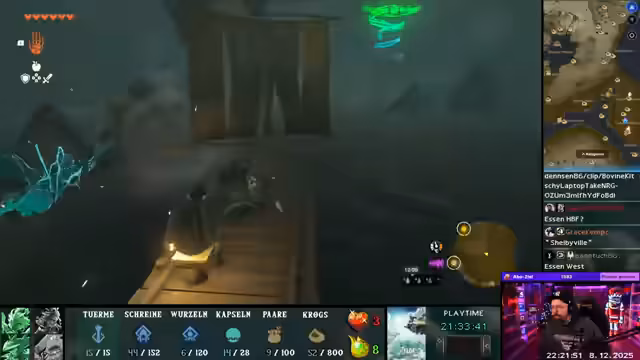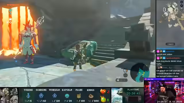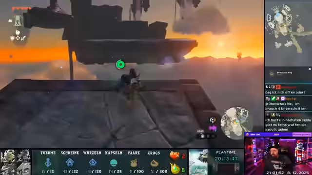 06:06:09Der Streamer erkundet Hyrule, sammelt Schreine und Crocs (Begleiter) und bewältigt komplexe Rätsel. Ein besonderes Ereignis ist die Quest mit NPC Sasan und Fiene: Sie suchen einen Schatz, finden aber nur einen Schrein, was als emotional wertvollere Belohnung beschrieben wird. Neben Upgrades für Ausdauer und Herzen werden Probleme mit der Gilde diskutiert – die Gründung scheitert an Regeln (zehn aktive Spieler in 30 Tagen). Die Erkundung zeigt auch technische Herausforderungen wie Regen, der das Klettern erschwert, und strategische Überlegungen zum Inventarmanagement. Der Streamer betont, dass 100% komplexe Sammelquests erfordern, die schwerer als in Breath of the Wild sind.