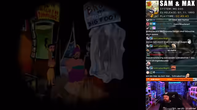 02:16:20Der Streamer kämpft mit den Rätseln in "Sam & Max" und findet es äußerst frustrierend. Er kritisiert die unklaren Hinweise, insbesondere, dass keine Texte beim Überfahren von Objekten erscheinen. Zudem stört ihn, dass Max oftmals vor Interaktionspunkten im Weg steht und so Klicks blockiert. Im Vergleich zu anderen Point-and-Click-Spielen wie "Simon the Sorcerer" fühlt sich die Steuerung und die Benutzerführung in "Sam & Max" holprig und ungenau an.