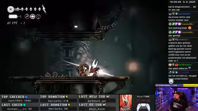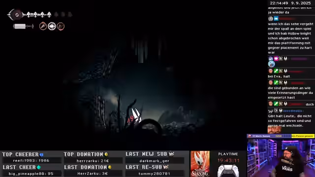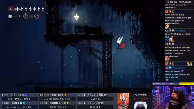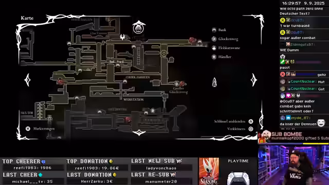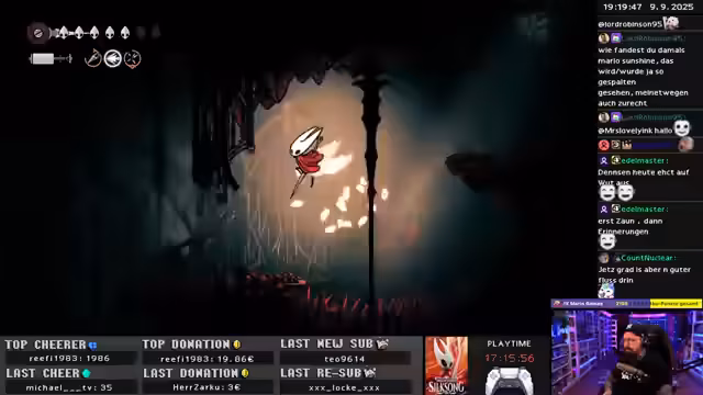 03:27:05Es beginnt mit der Erkundung eines neuen Gebiets in Hollow Knight: Silksong, wobei der Streamer den neu erworbenen Double Jump nutzt, um die Umgebung zu navigieren. Trotz des Fehlens einer Karte versucht er, sich durch Memorieren der Gebiete zu orientieren und experimentiert mit neuen Werkzeugen wie dem Bohrer. Die Erkundung führt ihn zu Metroid-ähnlichen Abschnitten, in denen er kleine Gebiete aufdeckt und letzte grüne Objekte findet. Der Streamer entdeckt ein Räderherz, das darauf hindeutet, dass noch weitere Gegenstände oder Fähigkeiten benötigt werden, um das Gebiet vollständig zu erkunden. Er äußert Frustration über die Erinnerungsmedaillons und versucht, kryptische Rätsel und Hinweise zu entschlüsseln, während er einen Aufzug entdeckt, der möglicherweise einen Shortcut darstellt. Die Suche nach dem richtigen Weg führt zu einem Kreislauf, bis er schließlich ein Materium findet, das Röhren und Behälter für die Aufbewahrung und Erforschung verschiedener Materialien enthält. Abschließend wird ein großer Oberfloh entdeckt, der sich als etwas harmloser herausstellt, da der Zweig des Streamers wieder zu einem Seidemeer wird.