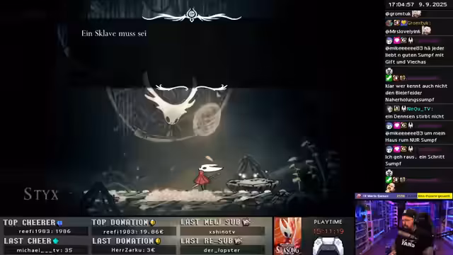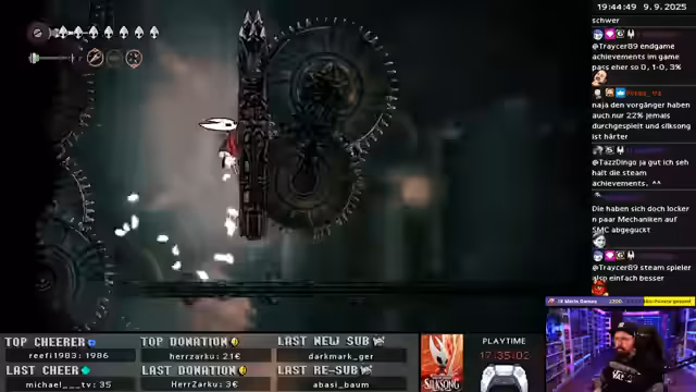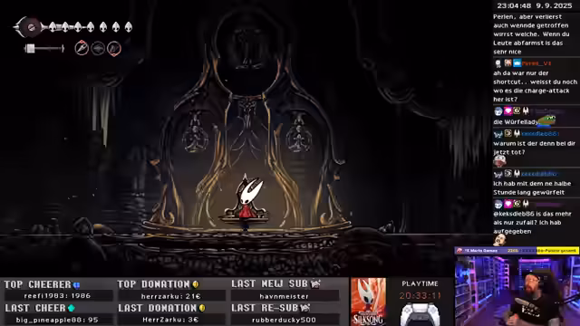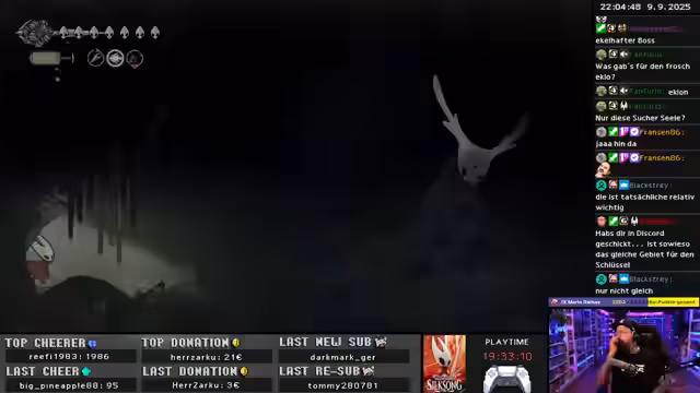 00:32:38Nach einer abschließenden Aktion mit den Follower-Tier-Plätzen wechselt der Streamer zum Spiel Hollow Knight: Silksong auf der PS5. Er äußert anfänglich große Freude über das Gameplay und das Movement, während er sich in der Zitadelle orientiert. Er gelangt schnell zu seinem ersten Boss, Falums, den er mit Leichtigkeit besiegt. Allerdings stößt er sofort auf eine seiner größten Frustrationsquellen: das Fehlen einer Karte in den neuen Gebieten, was die Orientierung extrem erschwert und den Spaß am Erkunden stark mindert.