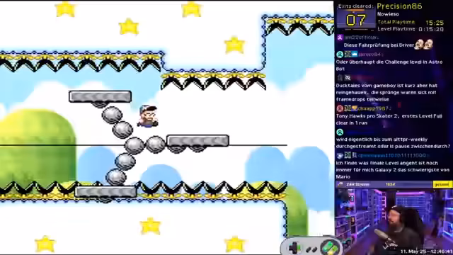 00:00:00Der Stream startet mit technischen Schwierigkeiten und Controller-Problemen. Der Streamer unternimmt mehrere Versuche, ein anspruchsvolles Ninji-Level in Super Mario World zu meistern. Er äußert sich frustriert über die hohe Schwierigkeit und die Unvorhersehbarkeit der Level-Designs, hebt aber auch hervor, dass die eingebauten Gags und das Gameplay fesselnd sind. Der Versuch nach dem anderen scheitert, was zu wütenden, aber auch humorvollen Reaktionen im Chat führt.