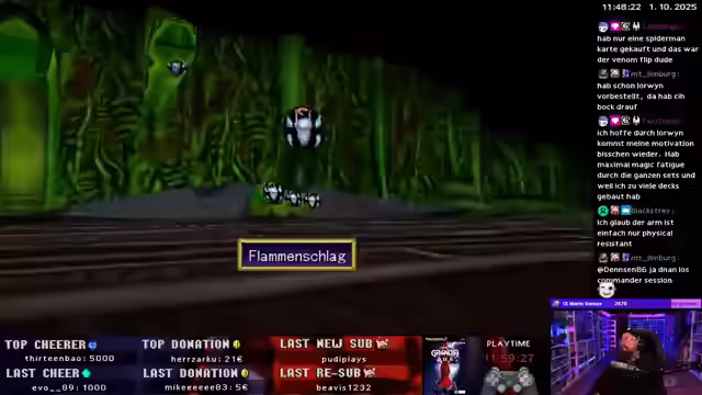 01:57:00Es wird ein kleines Special in zwei Wochen vor der Spielemesse angekündigt, bei dem der Streamer Besuch von Gästen bekommt und es etwas zum Thema Magic geben wird. Im Spiel selbst werden Anspielungen auf Technologie als das Böse und Gesellschaftskritik erkannt. Es wird eine düstere Atmosphäre mit Eindringlingen und der Eliminierung von Bedrohungen beschrieben, die an Brainwolds erinnert. Der Kampf gegen einen Gegner mit verschiedenen angreifbaren Körperteilen wird thematisiert, wobei Feuer als effektiv erscheint. Es wird überlegt, wie man den Schaden gegen bestimmte Gegner maximieren kann, wobei physischer Schaden als ineffektiv eingestuft wird. Persönliche Vorlieben für Commander-Decks in Magic: The Gathering werden diskutiert, insbesondere der Peter Parker Flip Commander mit Web-Slinging und Convoke. Der Bedarf an Heilung im Spiel wird erkannt und Spider-Man wird als Thema von geringem Interesse eingestuft. Es wird die Schwierigkeit erwähnt, Commander Decks fertigzustellen, da oft mehrere gleichzeitig angefangen, aber nicht beendet werden.
