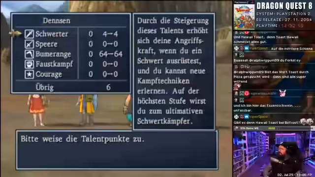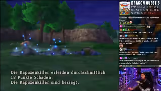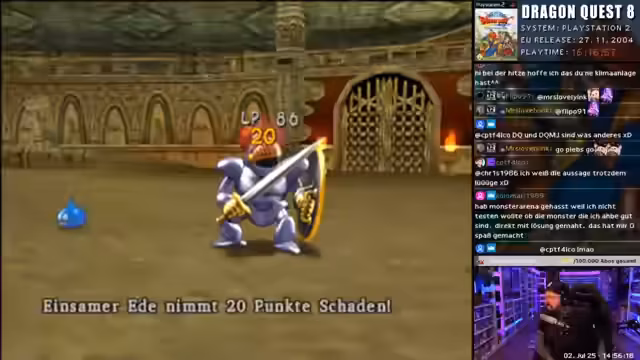 00:00:47Der Stream beginnt mit einem dynamischen Einstieg. Der Streamer, als Curry Karl bezeichnet, startet aggressiv ins Spiel und versucht, den Zuschauern sein ungewöhnliches Waschgame zu erklären, bricht die Erklärung aber sofort wieder ab, da er es selbst für albern hält. Dies führt zu einem humorvollen Dialog über das Spiel, in dem er zufällig die Präsentation von PlayStation-5-Geschenken für Kinder erwähnt und in das Gameplay von Dragon Quest 8 eintaucht.