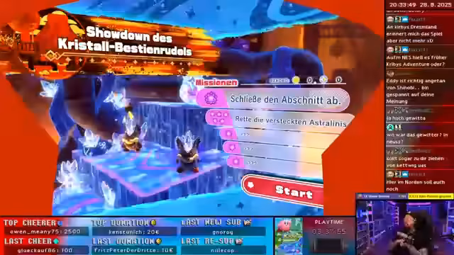 01:56:37Im DLC-Bereich taucht ein neuer Handlungsbogen auf: die Astralinis. Ein Asteritenschauer hat Teile eines Siegelkristalls auf die Welt fallen lassen, und Kirby muss diese Astralinis sammeln, um den Stern der Finsternis aufzuhalten. Der Streamer erkundet die neuen Level, die er als viel komplexer und besser designed im Vergleich zum Hauptspiel beschreibt. Er sammelt Astralinis, benutzt Upgrades und interagiert mit neuen NPCs wie dem Waddle-Astronom.