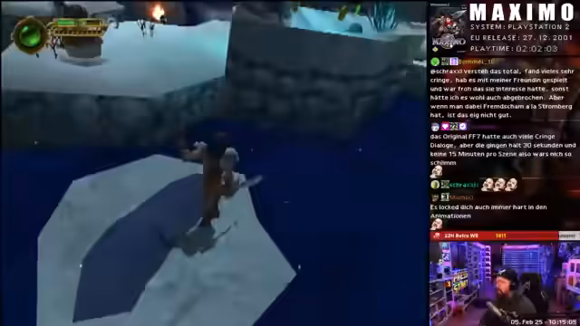 00:23:00Nach einer Unterbrechung wird Maximo fortgesetzt. Der Streamer hat inzwischen neue Fähigkeiten freigeschaltet und ist in einer neuen Welt, doch seine Frustration über das Spiel wächst. Er kritisiert die unfairen Kämpfe, bei denen er immer Schaden nimmt, und die unzureichende Kamerasteuerung. Das Spiel entwickelt sich für ihn zu einem reinen Parcours, da er sich nicht mehr traut, Gegner direkt anzugreifen, was den Spielgenomen stark beeinträchtigt.