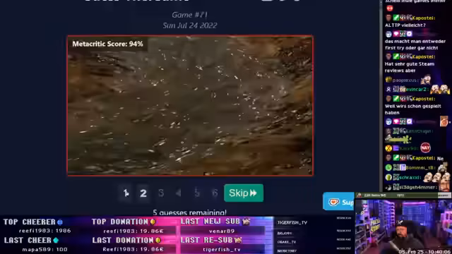 00:46:32Nach dem Ausfall von Maximo wechselt der Streamer zu einer anderen Aktivität, um die PS2 abkühlen zu lassen und den Zuschauern etwas anderes zu bieten. Er startet das Segment 'Guess the Game', bei dem Screenshots von verschiedenen Spielen vorgestellt werden. Er diskutiert über mögliche Titel wie God of War und Red Dead Redemption, zeigt sein breites Spielewissen und interagiert mit dem Chat über die Metacritic-Werte und die Erkennbarkeit der Spiele.