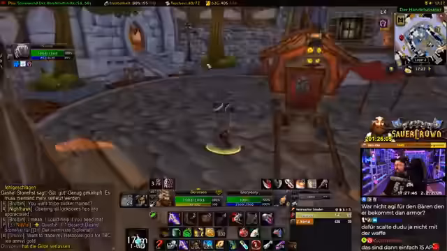 04:01:47Nachdem er Level 60 erreicht hat, plant der Streamer zukünftige Aktivitäten mit seiner Gilde. Sie planen einen Dungeon-Besuch für den darauffolgenden Donnerstag um 19 Uhr. Er klärt das Gruppen-Line-up: Er selbst als Magier, ein anderer als Tank, und ein weiterer als Heiler. Auch der Einsatz von zwei Kriegern wird diskutiert, um die Rollen flexibler zu gestalten.