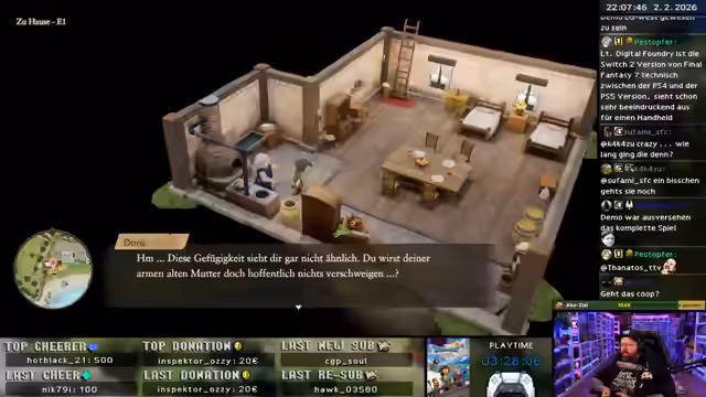 02:49:05Einige Zuschauer bringen das Thema Ernährung zur Sprache. Der Streamer erzählt, dass er sich bewusst ernährt, selbstgemachte Säfte mit Zitrone, Rote Bete und Ingwer zu sich nimmt und versucht, regional zu einkaufen. Er erwähnt auch seine Hobbys wie Backen und das Schmieden von Brötchen sowie den Besitz eines Pizzaofens, den er einweihen möchte. Dies zeigt den privaten und gesundheitlich bewussten Aspekt des Streamers neben dem Spiel.
