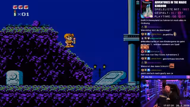00:46:33Der Streamer beginnt nun mit dem eigentlichen NES-Grind im Format 'Wonne oder Tonne'. Zuerst wird das Spiel 'Adventures in the Magic Kingdom' gezogen und gespielt. Das Spiel besteht aus verschiedenen Minispielen, darunter ein Rennen und ein Geisterspiel. Der Streamer gibt dem Spiel durchschnittliche bis schlechte Bewertungen, kritisiert die Steuerung im Rennspiel, insbesondere dass zwei Knöpfe beide zum Bremsen gedacht sind, und beendet das Spiel nach circa 20 Minuten.
