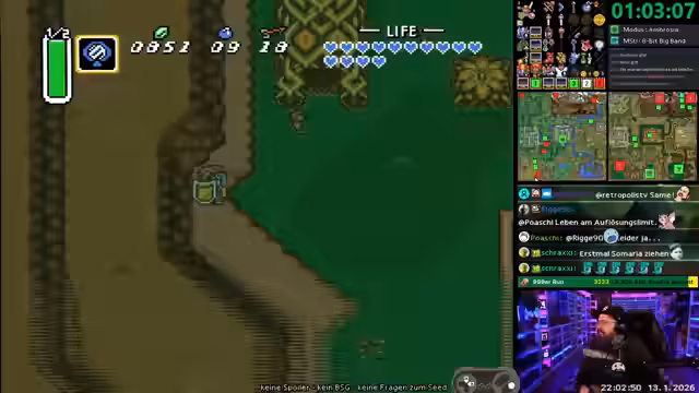 03:55:10Das Race beginnt mit dem Spiel eines Randomizer-Mods für Zelda: A Link to the Past. Der Streamer, als 'Randy' spielend, kommentiert den zufälligen Seed, der zu einem herausfordernden Start ohne wichtige Gegenstände wie Bomben führt. Dies führt zu Frust und Zeitverlust, da er die Dungeon-Lösungen improvisieren muss und auf fehlende Items angewiesen ist.