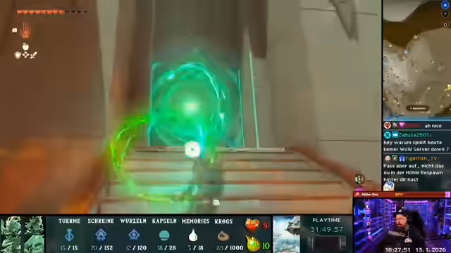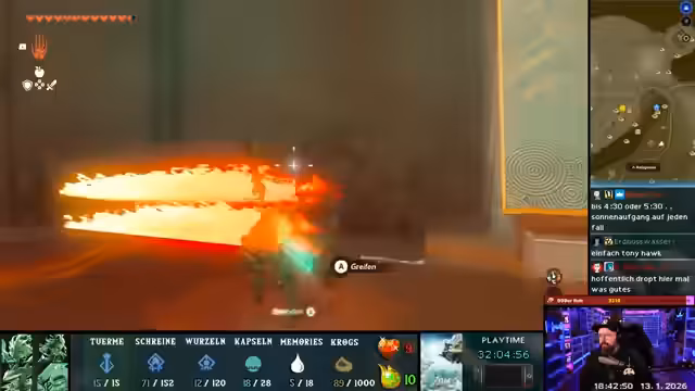 00:02:13Während des Spiels von Zelda: Tears of the Kingdom erlebt der Streamer sowohl Erfolg als auch tiefe Frustration. Nachdem er zunächst einen Puls verliert, findet er sich in einem Geheimgang wieder und triumphiert später über das Auffinden versteckter Krokodile und erlangt einen Schwert-Splitter. Diese wechselnden Emotionen, von Wut über Spielabbrüche bis hin zu Euphorie bei Funden, kennzeichnen seine intensive, aber auch emotional aufreibende Auseinandersetzung mit dem Spiel.