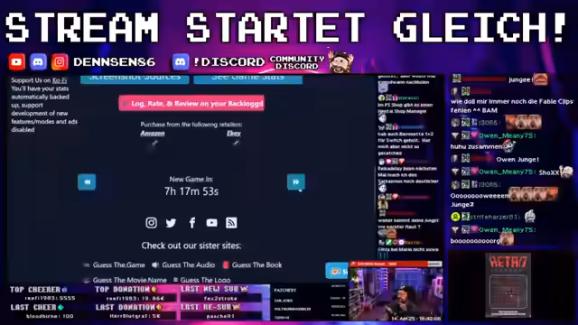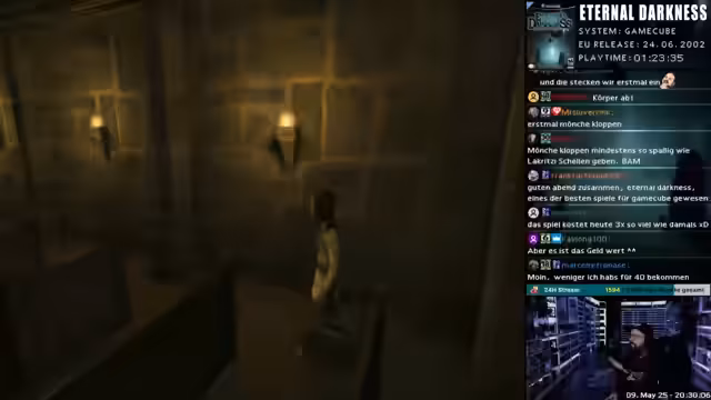 00:00:00Der Stream mit dem Titel '[FREItag stream] Grusel Action mit "Eternal Darkness" (GC) - Mein erstes mal !Holy EMP Stoertebekker' beginnt auf dem Kanal 'dennsen86'. Der Streamer drückt seine Vorfreude auf das Spiel aus, das er noch nie gespielt hat, aber das als das "Resident Evil von Nintendo" beschreibt. Er erwähnt, dass er die Stay Forever Folge dazu gehört hat und gespannt ist, was ihn erwartet. Der Streamer richtet sein Setup ein, passt die Helligkeit an und beginnt mit dem Spiel Eternal Darkness für den Gamecube.