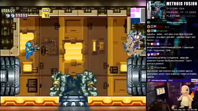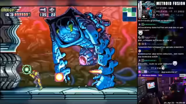 04:54:56Nach dem schweren Kampf mit Nightmare gibt der Streamer eine allgemeine Einschätzung zu Metroid Fusion ab. Er nennt das Spiel anfangs „geil“ mit „geilem Gameplay“ und „coolem Pacing“, findet jedoch, dass es mit der Zeit „immer schlechter“ wird und vor allem die Bosse „Müll“ und „nervig“ sind. Er hat den Space Jump erhalten und geht davon aus, dass das Spiel bald zu Ende ist. Für den Stream plant er bereits den nächsten Freitag, an dem er ein langes Spiel von Obscreen bestreiten wird, sofern sein Knie es zulässt.
